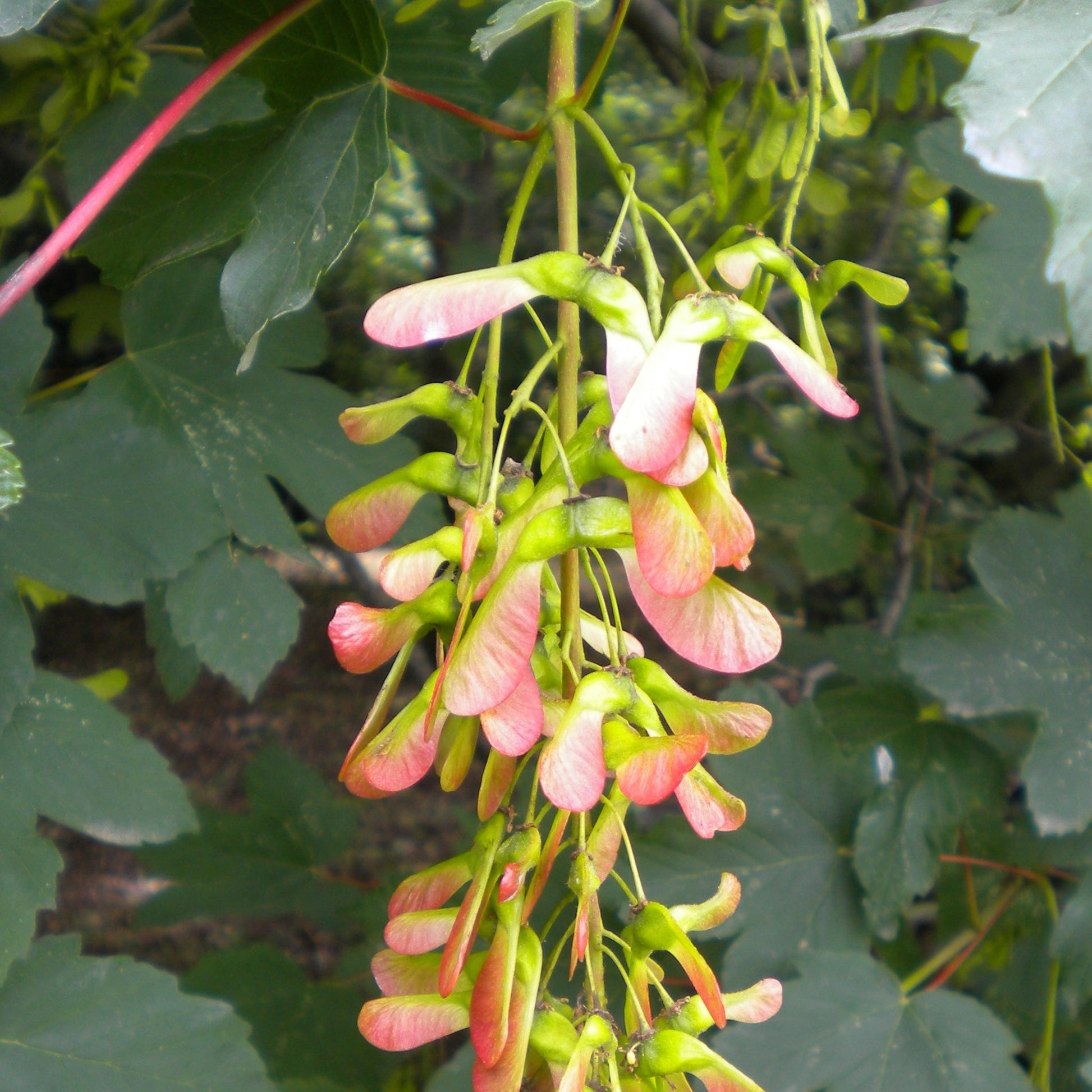 Acer pseudoplatanus is a deciduous tree up to 20-25 m tall. It has a cylindrical trunk and spreading crown. The bark in adult specimens comes off in plates, revealing the pinkish part underneath. The leaves are palmate with 5 slightly acute lobes and a weakly toothed margin, the upper side is dark green while the lower side is greyish green and are supported by reddish petioles. The yellow-green flowers are gathered in pendulous inflorescences. The fruit is a purple disamara.