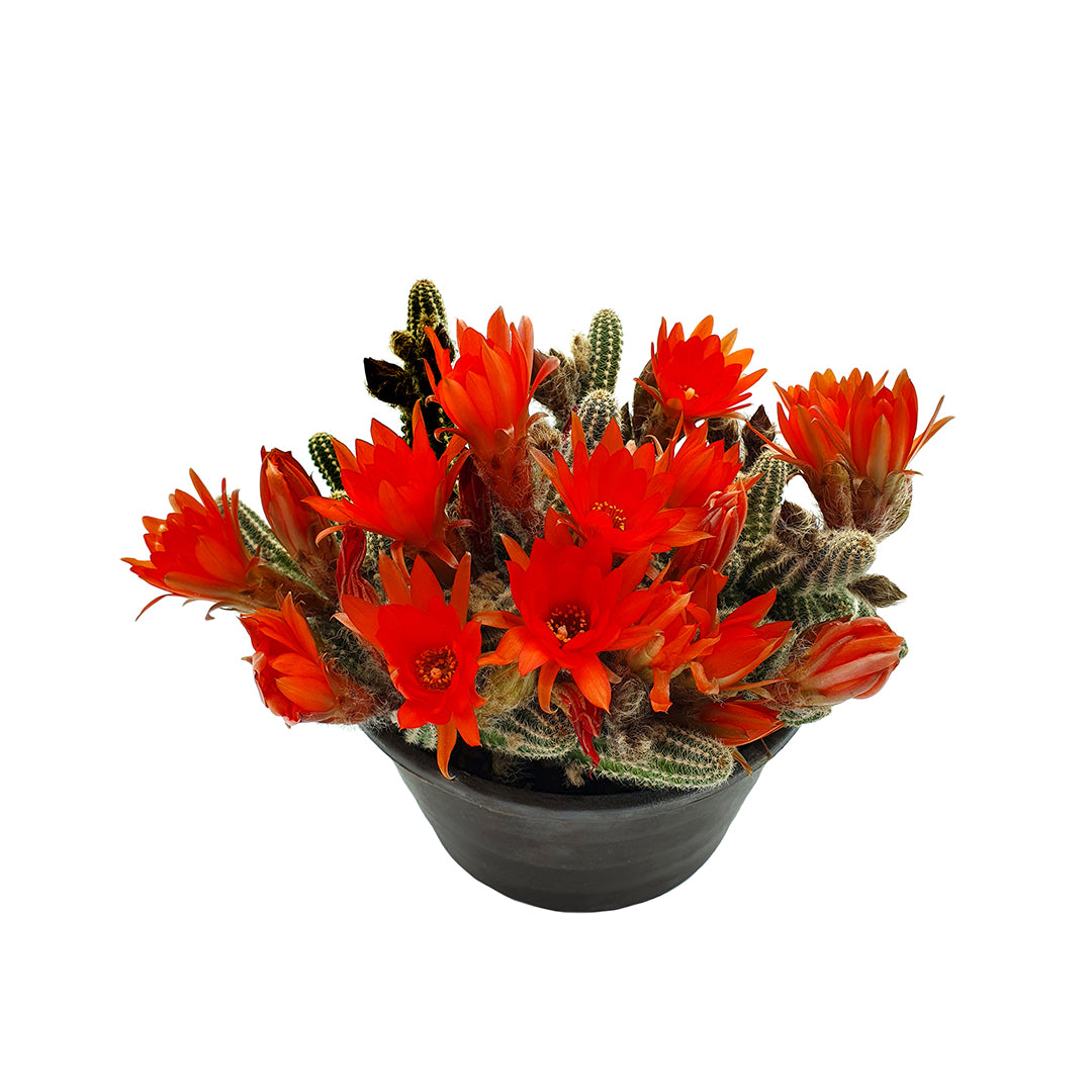 Genus of 50-120 species of cacti, sometimes bushy or tree-like, found in South America in different habitats. It forms low, tufty bushes composed of numerous cylindrical twigs that have up to 10 ribs and are equipped with slightly pronounced tubercles with from 10 to 12 spines. The color of the bush varies depending on exposure to the sun, in fact in normal conditions it has a light green color but with prolonged exposure to the sun's rays the color turns to bronze. The flowering period begins at the end of May and culminates at the end of July, the flowers are orange-red, funnel-shaped and develop at the apex of the areola.