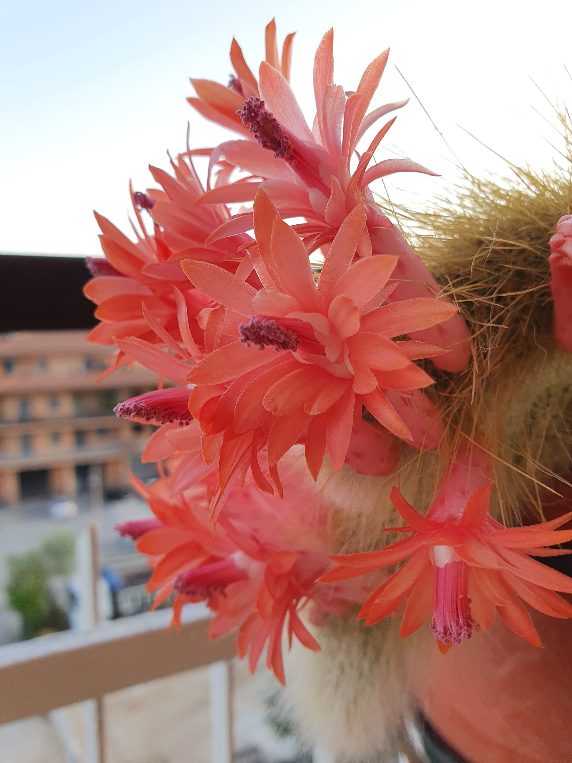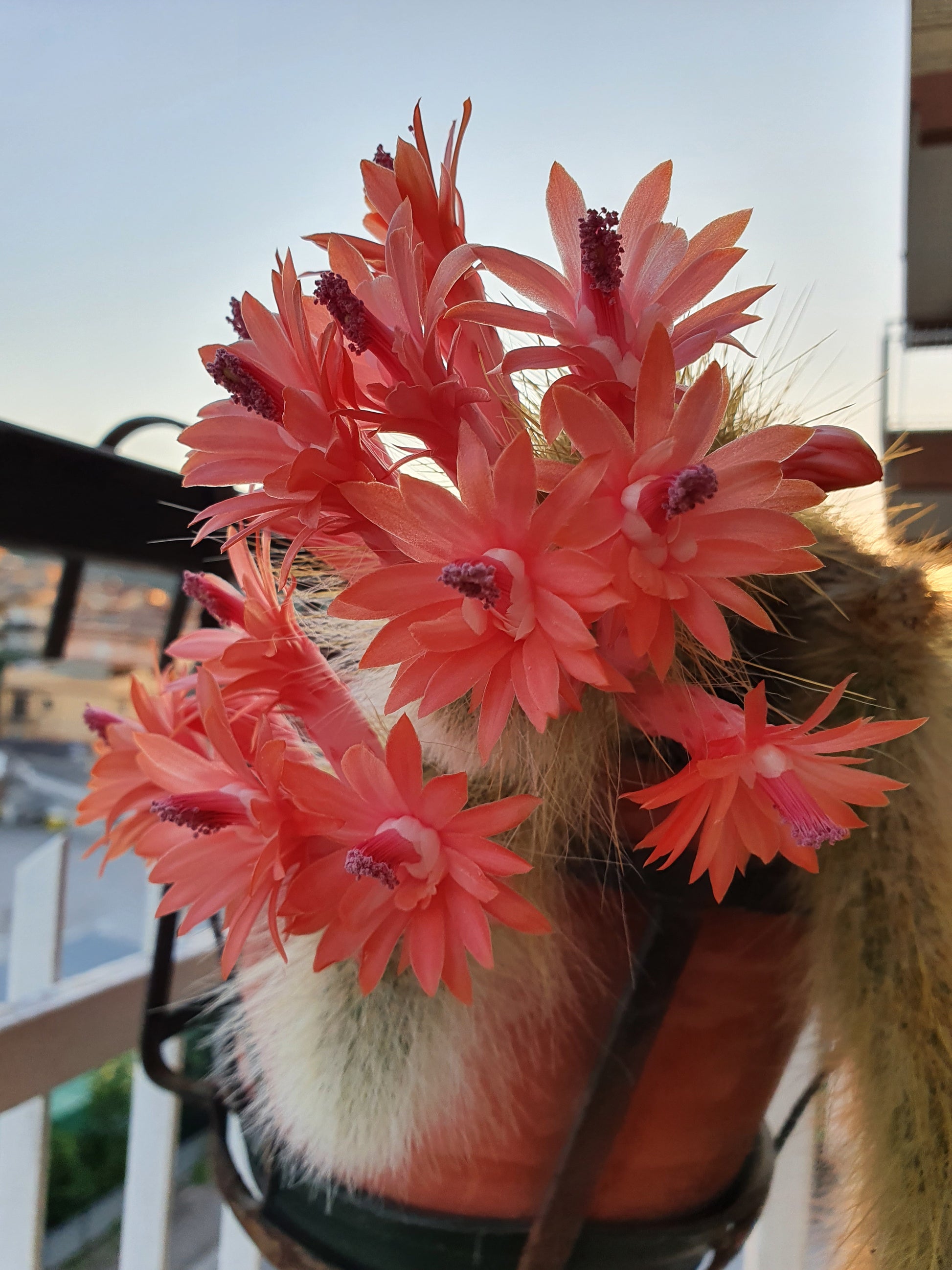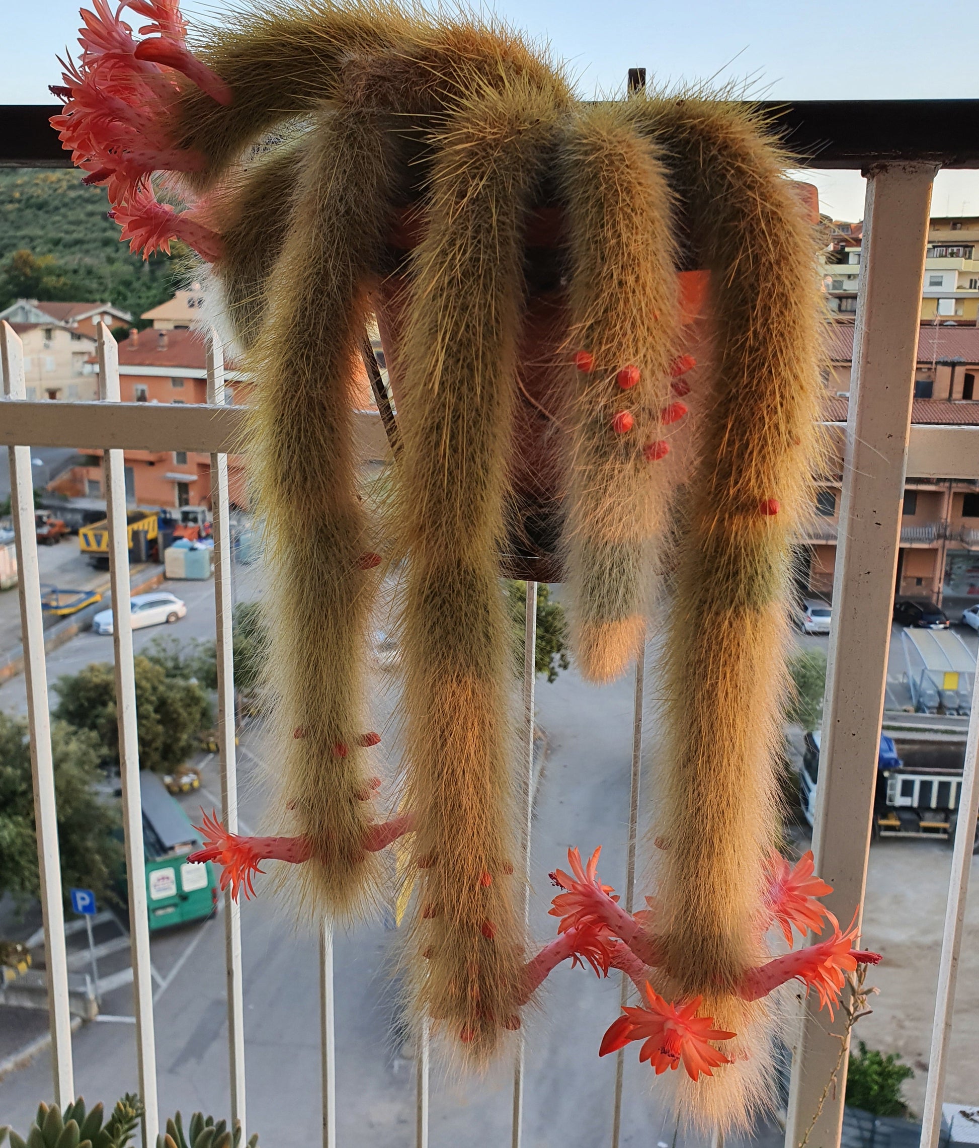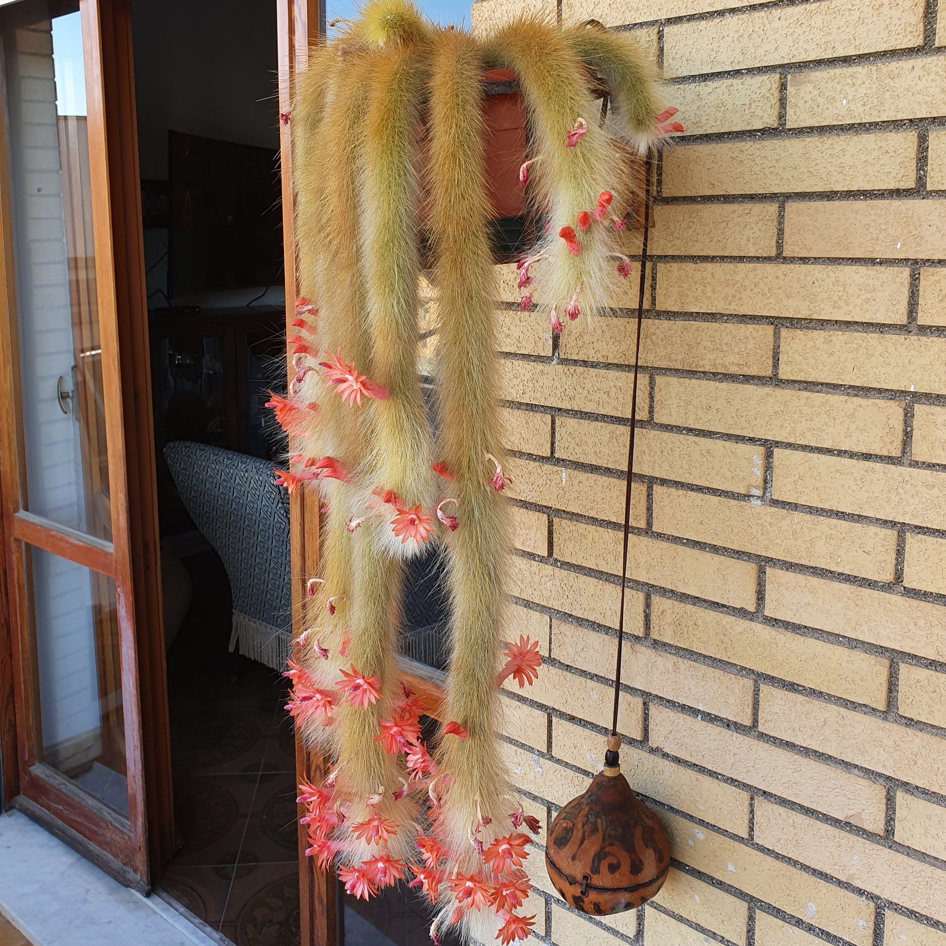 Genus composed of about 50 species of cacti, generally bushy, with an erect or prostrate habit, native to South America, present in different types of habitats. Hildewintera colademononis is an endemic species of the Department of Samaipata in Bolivia, it grows in a tropical jungle at the foot of the Andes at an altitude between 1300 and 1500 m above sea level on vertical rock faces in small pockets of earth. It has a drooping and bushy habit, being able to stretch up to 2 meters in length. The cylindrical stems of 3-4 cm in diameter are covered with soft golden yellow spines, not very sharp. In spring, numerous red-orange flowers appear at the top of the stems. The magnificent flowering is staggered and continues until the end of summer.