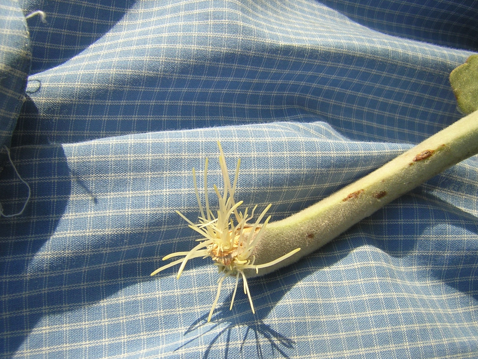 Genus of about 130 species of succulent plants that can be annual, biennial, climbing, shrubs or small trees. They grow in semi-desert regions or in shady areas of Saudi Arabia, Yemen, Central Africa, South Africa and Madagascar but also in Asia, Australia and Central America. Kelanchoe baherensis is a succulent perennial, evergreen, bushy, sometimes arboreal species up to 4-5 m tall. The leaves are large and velvety, up to 35 cm long, long-petiolate. The leaf blade is triangular in shape and slightly toothed, brown on the upper side and silvery on the lower side. At the end of winter, in mature plants, numerous inflorescences appear that carry small greenish-yellow flowers, with violet veins inside.