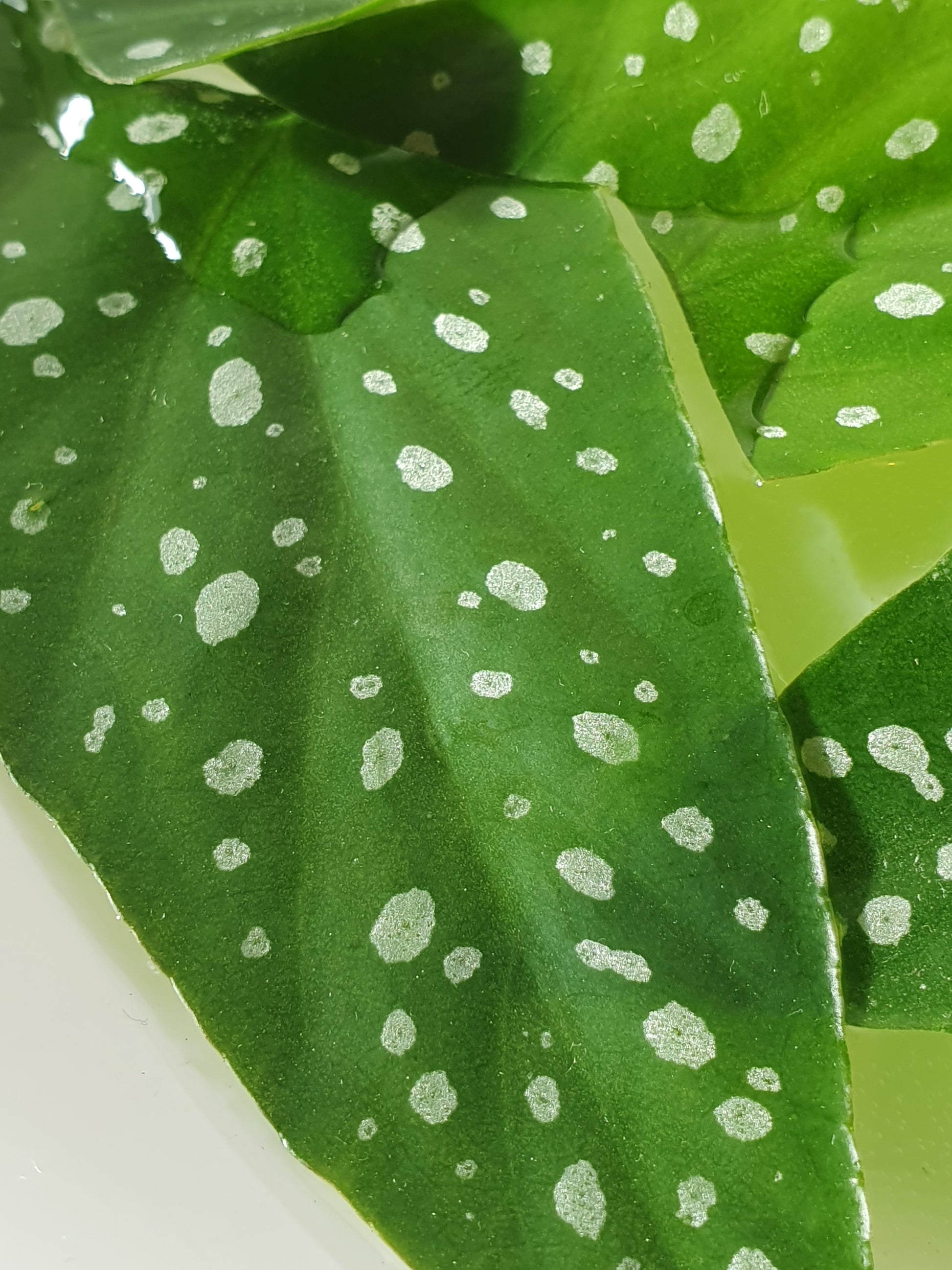 Le foglie allungate, asimmetricamente cuoriformi, sono di color verde chiaro puntinate da numerose piccole maculature argentee. I fiori portati da infiorescenze apicali sono numerosissimi e di color rosa intenso.