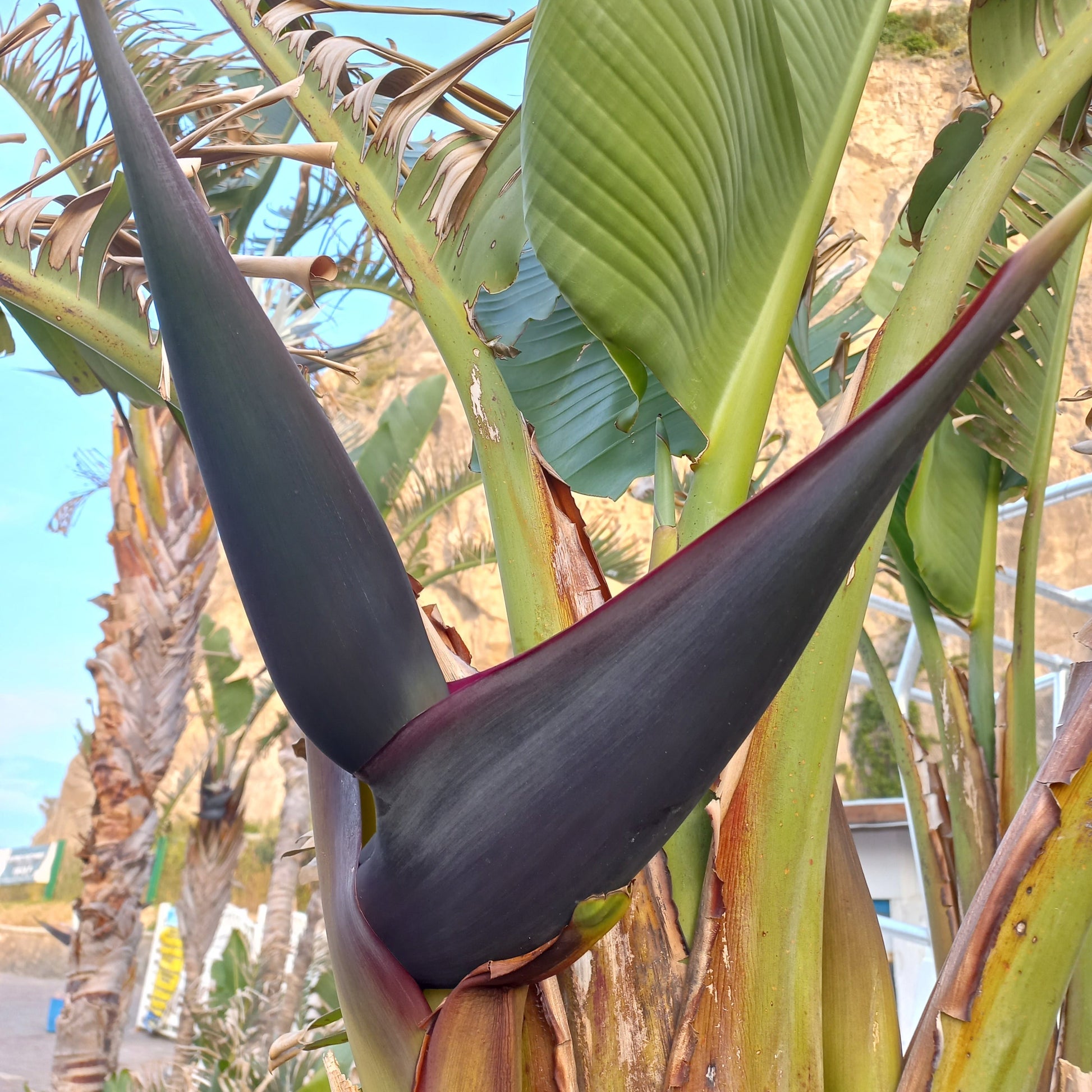 Strelitzia reginae is a perennial herbaceous plant with a bushy, acaule shape, with large fleshy fasciculate roots, which, if grown outdoors, develop in the ground up to a meter deep. The leaves are large, oval, elliptical, equipped with a very marked midrib, 15-20 cm wide and up to 50 cm long, leathery, covered by bloom on the lower side with wavy margins. Petioles 100-150 cm long. The inflorescences, borne on long stems, longer than the leaves, are made up of 5-8 flowers. These have a very particular shape that resembles an orange, yellow and intense blue heron beak. The fruit is a trilocular capsule in which the rounded, black seeds with an orange feathery tuft are formed. Strelitzia are very long-lived plants and if planted in the ground they form very large tufts. There are reports of strelitziae over 100 years old.
