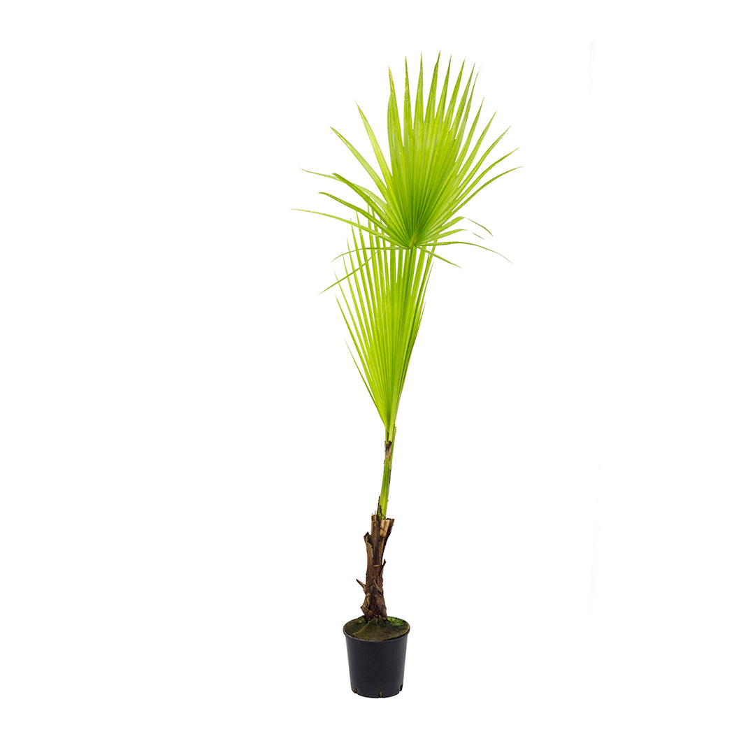 Palm characterized by an erect and stocky trunk that can reach 15-18 meters in height. The leaves are fan-shaped, divided into a large number of segments whose margins are covered with long whitish filaments. The white flowers are gathered in large pendulous inflorescences that appear in the axils of the leaves. The small, black and ovoid fruits are collected in bunches which are also pendulous.