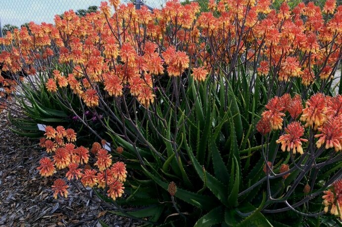 Genere di 300 specie di sempreverdi perenni con rosette di foglie da piccole a grandi. Alcune sono simili ad arbusti, poche arborescenti. Si possono trovare a varie altitudini nelle isole di Capo Verde, nell’Africa tropicale e meridionale, in Madagascar e nella penisola Arabica. Aloe camperi è una succulenta a portamento cespuglioso composta da rosette basse. Con gli anni le piante accestiscono notevolmente e formano grossi cespi che possono raggiungere 2 m di diametro. Le foglie di colore verde-glauco, succulente presentano numerose maculature bianco crema e sono lunghe fino 40/50 cm con margini dentati rossastri, non pungenti. In autunno le rosette formano numerose infiorescenze apicali, molto decorative alte 30- 50 cm con fiori tubulari rosso-arancio.