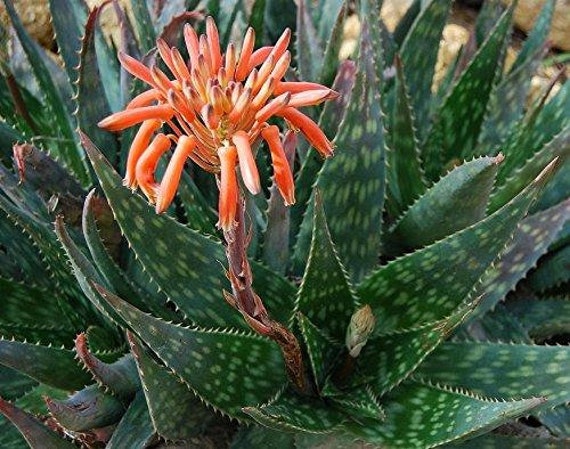 Genere di 300 specie di sempreverdi perenni con rosette di foglie da piccole a grandi. Alcune sono simili ad arbusti, poche arborescenti. Si possono trovare a varie altitudini nelle isole di Capo Verde, nell’Africa tropicale e meridionale, in Madagascar e nella penisola Arabica. L’Aloe Saponaria è una succulenta acaule o con fusti brevi, con rosette di foglie dentate, lanceolate verde medio o scuro, lunghe 20 cm o più con segni oblunghi bianchi. La pianta forma densi gruppi di rosette da polloni basali o stoloniferi. In estate porta pannocchie apicali lunghe 40-60 cm di fiori cilindrici da rossi a gialli. Può raggiungere i 70 cm di altezza.