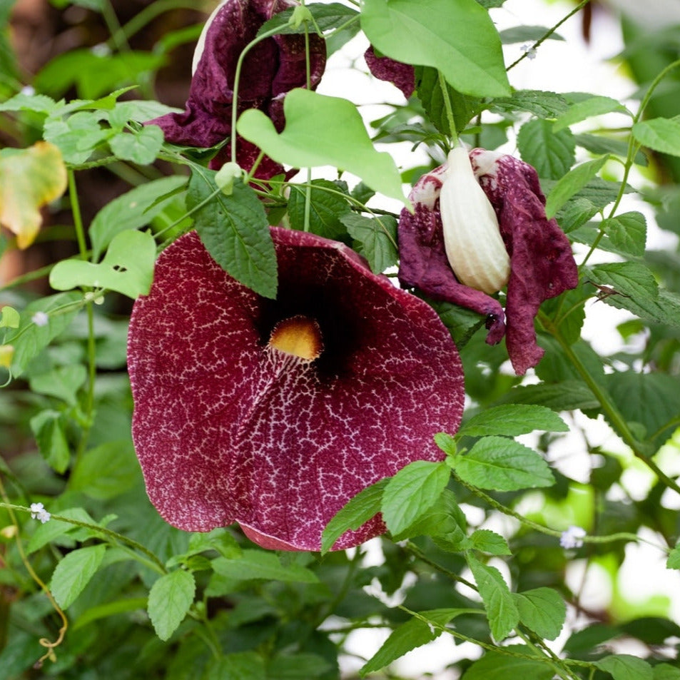 Genere che comprende oltre 500 specie di piante erbacee perenni, rampicanti o suffruticose, diffuse nelle regioni tropicali e temperate di Asia, Europa e Americhe. Appartenente alla famiglia delle Aristolochiaceae, comprende numerose specie ornamentali note per i fiori insoliti e spettacolari. Aristolochia gigantea è una liana tropicale sempreverde a rapido accrescimento, originaria del Brasile. Raggiunge in coltivazione un’altezza di 4–6 metri se dotata di un adeguato supporto. I fusti sono sottili, flessibili e volubili, mentre le foglie sono cuoriformi, larghe fino a 15 cm, di colore verde brillante e leggermente coriacee. La fioritura avviene dalla tarda primavera fino all’autunno, con grandi fiori a forma di pipa, lunghi anche 20–30 cm, di colore porpora scuro con screziature biancastre e gola giallo-verdastra. I fiori sono privi di profumo gradevole, ma molto ornamentali per forma e dimensione.