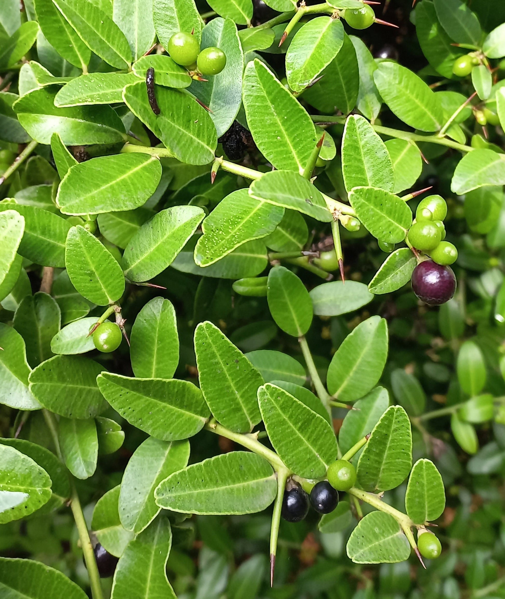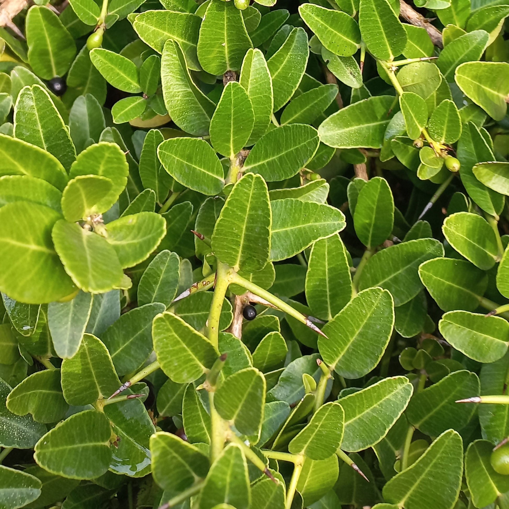 Atalantia buxifolia è un piccolo agrume sempreverde, a portamento arbustivo o di alberello compatto, che raggiunge generalmente un’altezza compresa tra i 3 e i 5 metri. La chioma, fitta e cespugliosa, è caratterizzata da piccole spine acuminate, lunghe fino a mezzo centimetro, inserite all’ascella delle foglie. Le foglie sono alterne, piccole, di forma obovata e di un bel verde scuro lucido, simili a quelle del Bosso, da cui deriva il nome comune. La fioritura avviene tra la tarda primavera e l’inizio dell’estate, con piccoli fiori bianchi, simili a quelli degli agrumi tradizionali, delicatamente profumati. I frutti, sferici e di dimensioni molto ridotte (0,5–1 cm di diametro), diventano neri a maturità. Non sono commestibili, ma contribuiscono all’interesse ornamentale della pianta.