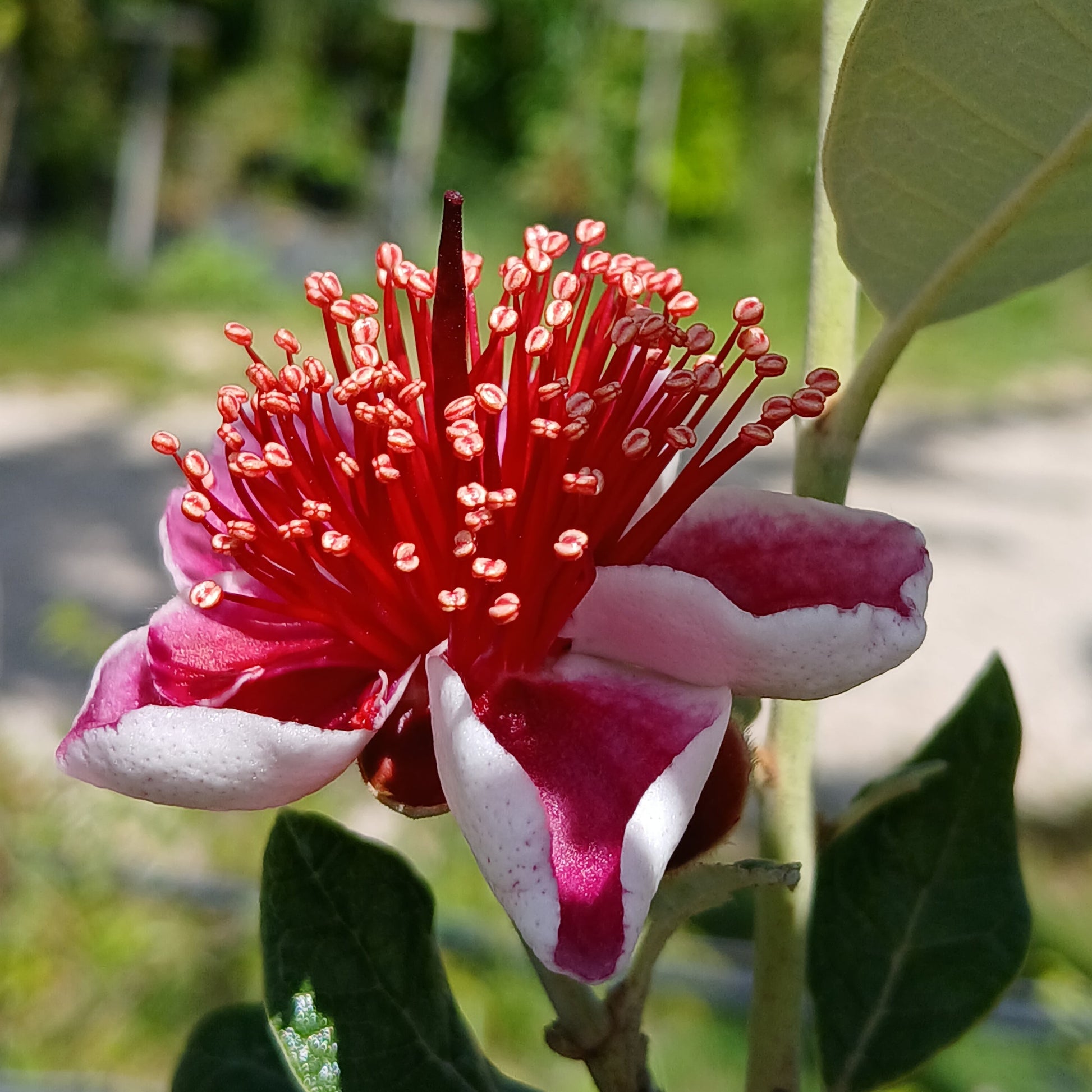 Arbusto o piccolo albero sempreverde alto fino a 4-5 metri caratterizzato da una bellissima e vivace fioritura primaverile. La chioma è di forma arrotondata, la corteccia è liscia di color grigio chiaro, mentre le foglie sono ellittiche, coriacee, lucide, di colore verde chiaro, argentate nella pagina inferiore. I fiori, che compaiono a primavera inoltrata, sono molto numerosi, con petali bianco-rosati e stami rosso corallo piuttosto vistosi. Il frutto è una bacca ovale commestibile, con buccia verde e polpa biancastra gelatinosa dal vago sapore di fragola e limone. I fiori sono commestibili e ottimi da consumare freschi, per la guarnizione di dolci o per la preparazione di conserve. Questa cultivar ha frutti grandi, succosi, di ottimo sapore ed essendo autofertile, non richiede impollinatore.