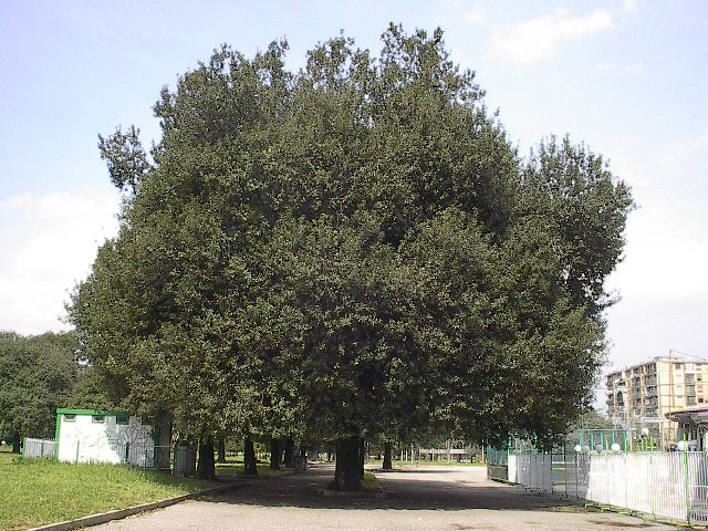 Genere di circa 600 specie di alberi e arbusti monoici, semi decidui o sempreverdi, ampiamente distribuiti in boschi e macchia dell’emisfero settentrionale. Il Quercus ilex è un albero sempreverde, alto fino 20 metri, di aspetto imponente con chioma globosa ed espansa. Tronco eretto e robusto, presto diviso in grosse branche, con corteccia bruno-scuro nerastra, rotta in piccole squame angolose. Le foglie sono estremamente variabili, lanceolate o ellittiche, di colore verde scuro, lucide sulla pagina superiore, bianco tormentose su quella inferiore a margine intero o dentato, a margine spinoso nelle piante giovani come l’agrifoglio da cui prende il