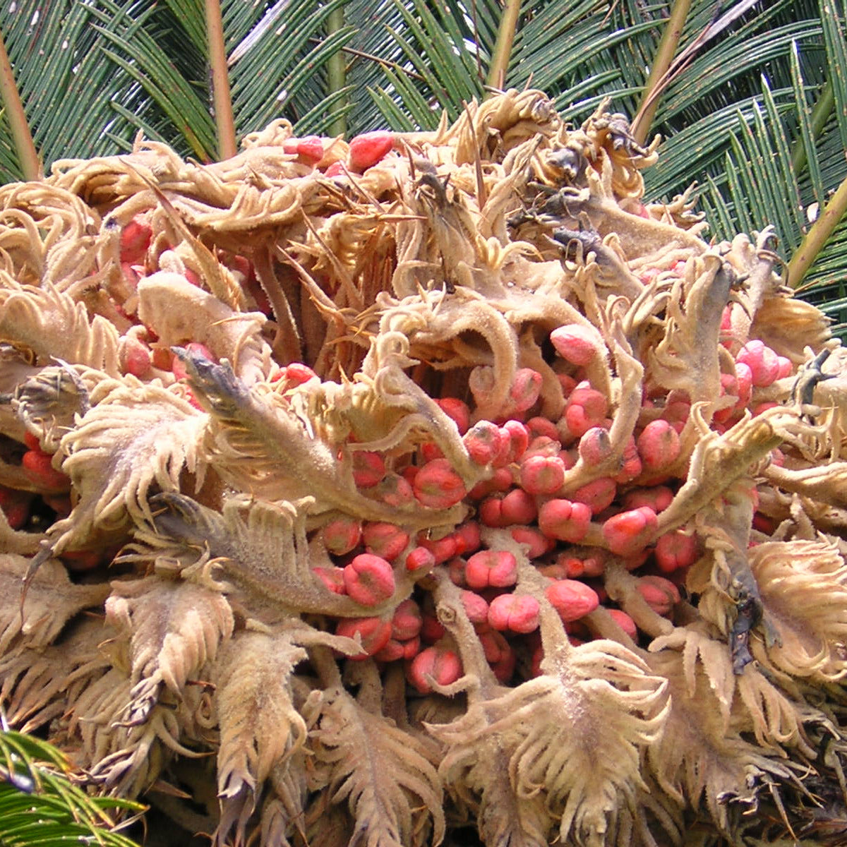 Genere di circa 15 specie di cicadee che crescono sui pendii secchi e pietrosi, nei deserti semi aridi e nei boschi chiari in un areale che va dal Madagascar all’Asia meridionale e sudorientale, all’Australia e alle isole dell’oceano Pacifico. Cycas revoluta è una cicadea molto longeva che nell'aspetto ricorda una palmetta sia per il fusto, poco ramificato, sia per la disposizione delle foglie, grandi e pennate poste a spirale alla sommità del fusto, come una corona. Il fusto raggiunge un diametro di circa 20-30 cm ed ha una crescita molto lenta, gli esemplari molto anziani possono eccezionalmente raggiungere i 6-7 m di altezza, ma generalmente arrivano in coltivazione ai 2-3 m. Le foglie, di colore verde brillante e lunghe sino a 1,5 metri, sono pennate, leggermente arcuate, lucide ed appuntite. Le singole foglioline, rigide e sottili, sono lunghe 8-18 cm; quelle più vicine al fusto si modificano in forma di spine. Le foglie giovani appaiono in primavera all'apice del fusto in gruppi numerosi; al momento dell'emergenza dal fusto sono raggomitolate e coperte da una densa peluria; nel giro di pochi giorni si dispiegano e raggiungono rapidamente l'aspetto delle foglie mature. Questa pianta è dioica con individui maschili e femminili. Dopo 15-20 anni producono particolari infiorescenze dette coni. Il fiore della femmina è quasi sferico giallo crema ed all’interno porta numerosi semi rosso- arancio. Il fiore maschile è più lungo e riverso a maturità e produce solo il polline.