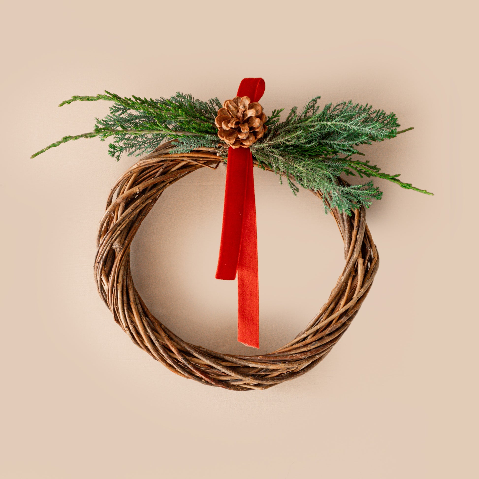 Ghirlanda di Natale intrecciata con pigna e nastro rosso – Ø 20 cm