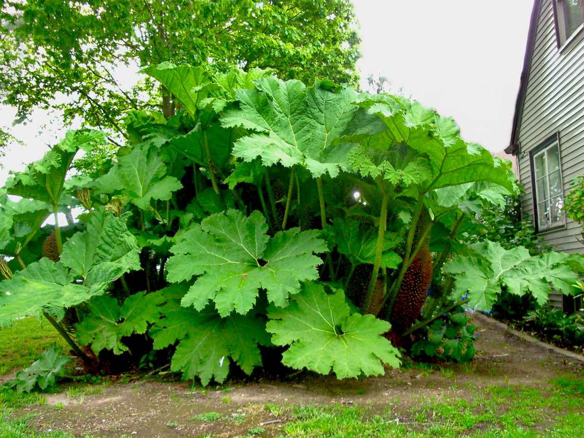 Pianta erbacea imponente che può raggiungere i due metri e mezzo d’altezza. Produce foglie di grandi dimensioni larghe fino a 3 metri, riunite in cespi maestosi. I fiori sono molto meno appariscenti e di dimensioni ridotte. Appaiono riuniti in infiorescenze a pannocchie e sono di colore rossastro.