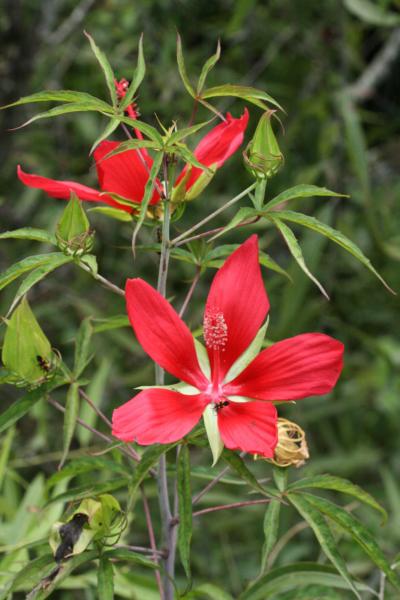 Genere di oltre 200 specie di arbusti, annuali e perenni erbacee, decidui e sempreverdi, ampiamente distribuite nelle regioni caldo-temperate, subtropicali e tropicali, dove vivono in svariati habitat. Hibiscus coccineus è un’erbacea perenne alta fino a 100-160 cm con rami poco ramificati e foglie palmate lunghe 10-15 cm. Durante l'inverno i fusti erbacei muoiono e restano vitali le radici e il colletto, dal quale nella primavera successiva spuntano i nuovi germogli. A maturità la pianta può formare grossi cespi con numerosi germogli. I fiori sono di colore rosso con 5 petali e raggiungono i 15 cm di diametro. I frutti sono capsule sferiche contenenti numerosi piccoli semi di color marrone chiaro.