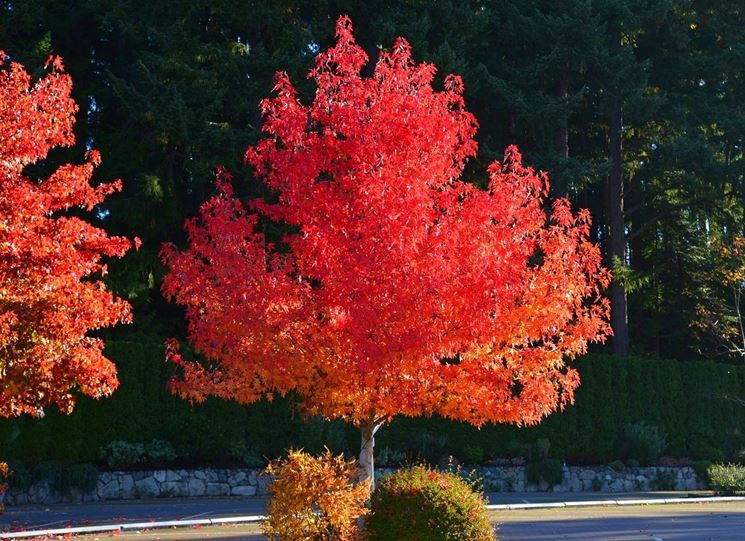Genere comprendente 4 specie di alberi decidui monoici che vivono principalmente nei boschi umidi dell’asia, dell’America e del Messico. Il Liquidambar styraciflua è un albero deciduo di grandi dimensioni che può raggiungere i 25-30 metri d’altezza. Presenta tronco slanciato e molto ramificato. La chioma inizialmente piramidale, diventa ovale negli esemplari adulti. Le foglie sono alterne, palmate, con margine seghettato di color verde scuro, mentre in autunno, prima della caduta, assumono magnifiche tonalità rosse. I fiori sono poco vistosi, di colore giallo-verde. Il frutto è un’infruttescenza globosa, legnosa a maturità.