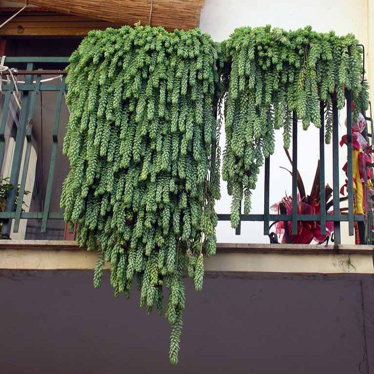 Genere che comprende circa 400 specie di piante succulente, annuali, perenni, suffrutici o arbustive, originarie delle regioni temperate e montane dell’emisfero settentrionale, con alcune specie presenti anche in aree aride del Sudafrica. Sedum morganianum è una pianta succulenta sempreverde, originaria del Messico, a portamento decombente o ricadente. I fusti sono carnosi, ricoperti densamente da foglie molto succulente, di colore verde glauco con riflessi azzurrini, disposte a spirale lungo i fusti, che possono raggiungere oltre 1 metro di lunghezza. Le foglie sono lunghe, appuntite e facilmente fragili al tatto. La fioritura avviene durante la stagione calda, con piccoli fiori a stella di colore rosa intenso o rosso corallo, disposti in infiorescenze apicali. Differenze rispetto a Sedum morganianum var. burrito Sedum morganianum si distingue dalla varietà ‘burrito’ per le foglie più grandi, appuntite e leggermente incurvate, mentre ‘burrito’ ha foglie più piccole, tondeggianti e ravvicinate. Inoltre, le foglie di morganianum sono generalmente più fragili al tatto, mentre ‘burrito’ ha un aspetto più compatto e regolare. La fioritura è simile in entrambe, ma S. morganianum ha fiori rossi mentre S. burrito li ha rosa.